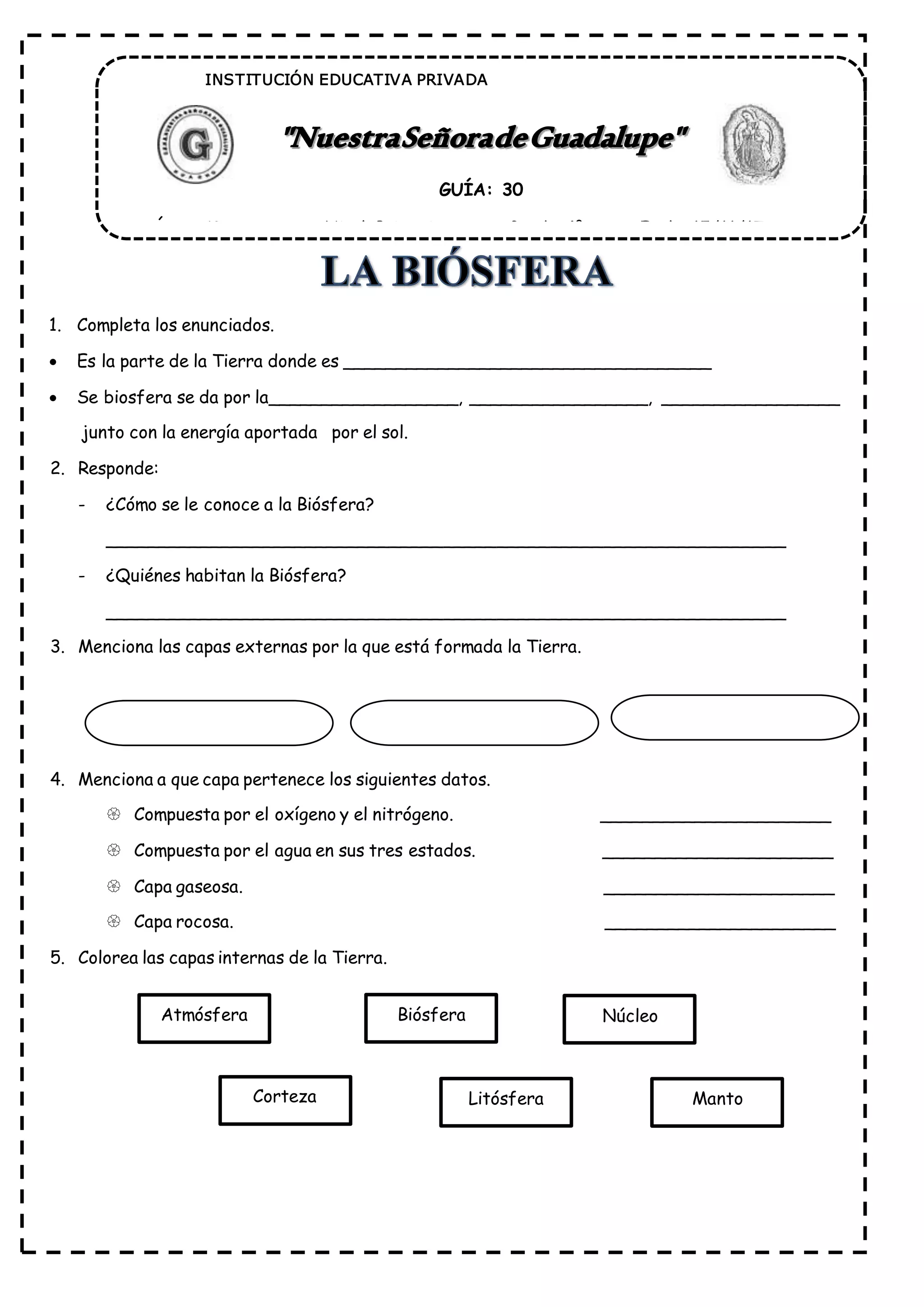 Este documento presenta información sobre las capas de la Tierra. Explica que la biosfera está formada por la interacción de la vida, la atmósfera, la hidrósfera y la energía del sol. Menciona las capas externas de la Tierra como la atmósfera, la litósfera y la hidrósfera, y las capas internas como el núcleo, el manto y la corteza. Proporciona detalles sobre la composición y características de cada capa.
