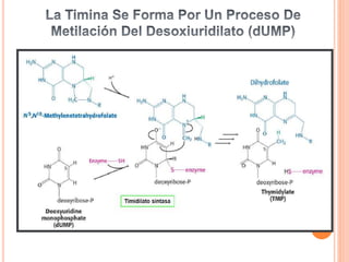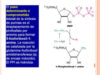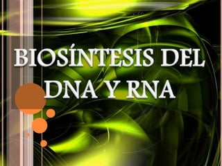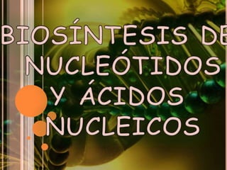 El documento describe la biosíntesis de nucleótidos a través de dos vías: la vía de novo y la vía de salvamento. Explica los pasos de la síntesis de las bases pirimidínicas y púricas, incluyendo las enzimas y reacciones involucradas. También cubre la replicación del ADN, describiendo su mecanismo semiconservador y los procesos de iniciación, progresión y terminación de la replicación.
