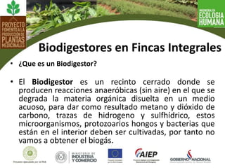 El documento describe los biofertilizantes producidos por los biodigestores, incluyendo el Biol (líquido) y el Biosol (sólido). Los biodigestores anaeróbicos producen biogás además de los biofertilizantes ricos en nutrientes como nitrógeno, fósforo y potasio. Estos biofertilizantes mejoran la estructura del suelo y los rendimientos de los cultivos de manera sostenible con menos impacto ambiental que los fertilizantes químicos.