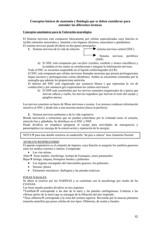 Este documento presenta conceptos básicos de anatomía y fisiología del sistema nervioso, respiratorio y circulatorio. Describe que el sistema nervioso está compuesto de células especializadas que reciben estímulos y los transmiten a los órganos efectores, y que puede dividirse en sistema nervioso central y periférico. También describe la estructura y función del aparato respiratorio y circulatorio, incluyendo los pulmones, corazón, arterias y venas.