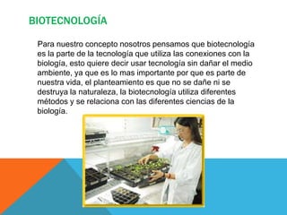 La biotecnología utiliza la tecnología de manera que no dañe el medio ambiente. Usa diferentes métodos relacionados con las ciencias de la biología. El documento también explica que la biotecnología puede ayudar a producir alimentos nutritivos de manera más fácil y rápida, así como también tratar enfermedades y reducir la contaminación.