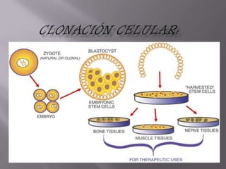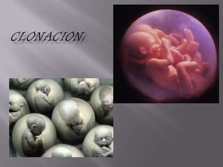 Este documento trata sobre la clonación. Explica que la clonación es el proceso de crear copias idénticas de un organismo, célula o molécula ya desarrollada de forma asexual. También describe diferentes tipos de clonación como la clonación celular, clonación de organismos de forma natural, clonación molecular y clonación terapéutica. Finalmente, discute los problemas éticos relacionados con la clonación humana.
