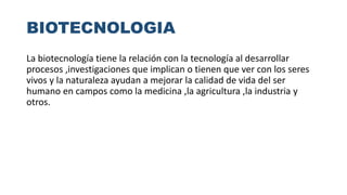 La biotecnología implica el desarrollo de procesos relacionados con seres vivos que mejoran la vida humana en campos como medicina y agricultura. Desde sus inicios, ha contribuido a innovaciones como la domesticación de especies y la manipulación genética. Sin embargo, sus aplicaciones plantean desafíos legales y éticos, especialmente en la utilización de hormonas y clonación, que pueden tener implicaciones negativas en la salud y el medio ambiente.