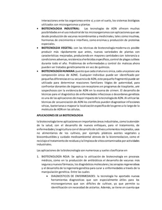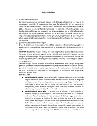 Este documento describe los diferentes aspectos de la biotecnología. Explica que la biotecnología utiliza organismos vivos o sus componentes para satisfacer las necesidades humanas en áreas como la agricultura, la medicina y la industria. Luego describe las diferentes aplicaciones de la biotecnología, incluida la biotecnología roja para la medicina, la biotecnología verde para la agricultura, y la biotecnología industrial. Finalmente, discute algunas implicaciones éticas y ecológicas del uso de la