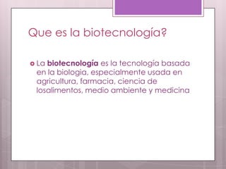 La biotecnología es la aplicación de organismos vivos o sus derivados para crear o modificar productos. Se desarrolla de forma multidisciplinaria e involucra campos como la biología, genética y medicina. Tiene aplicaciones en la agricultura, medicina, industria y medio ambiente, como la biorremediación. Algunos riesgos incluyen la polinización cruzada y la transferencia de toxinas entre organismos.