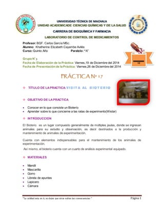 Este documento describe una práctica de laboratorio sobre el manejo de ratas de experimentación en un bioterio universitario. Explica que el bioterio contiene jaulas y equipos para el cuidado y estudio de los animales, así como áreas designadas para ensayos, disección, limpieza y maternidad. Además, detalla los procedimientos de alimentación, limpieza y manipulación de las ratas para garantizar su bienestar y la seguridad del personal, concluyendo que la práctica permitió conocer los aspectos clave del