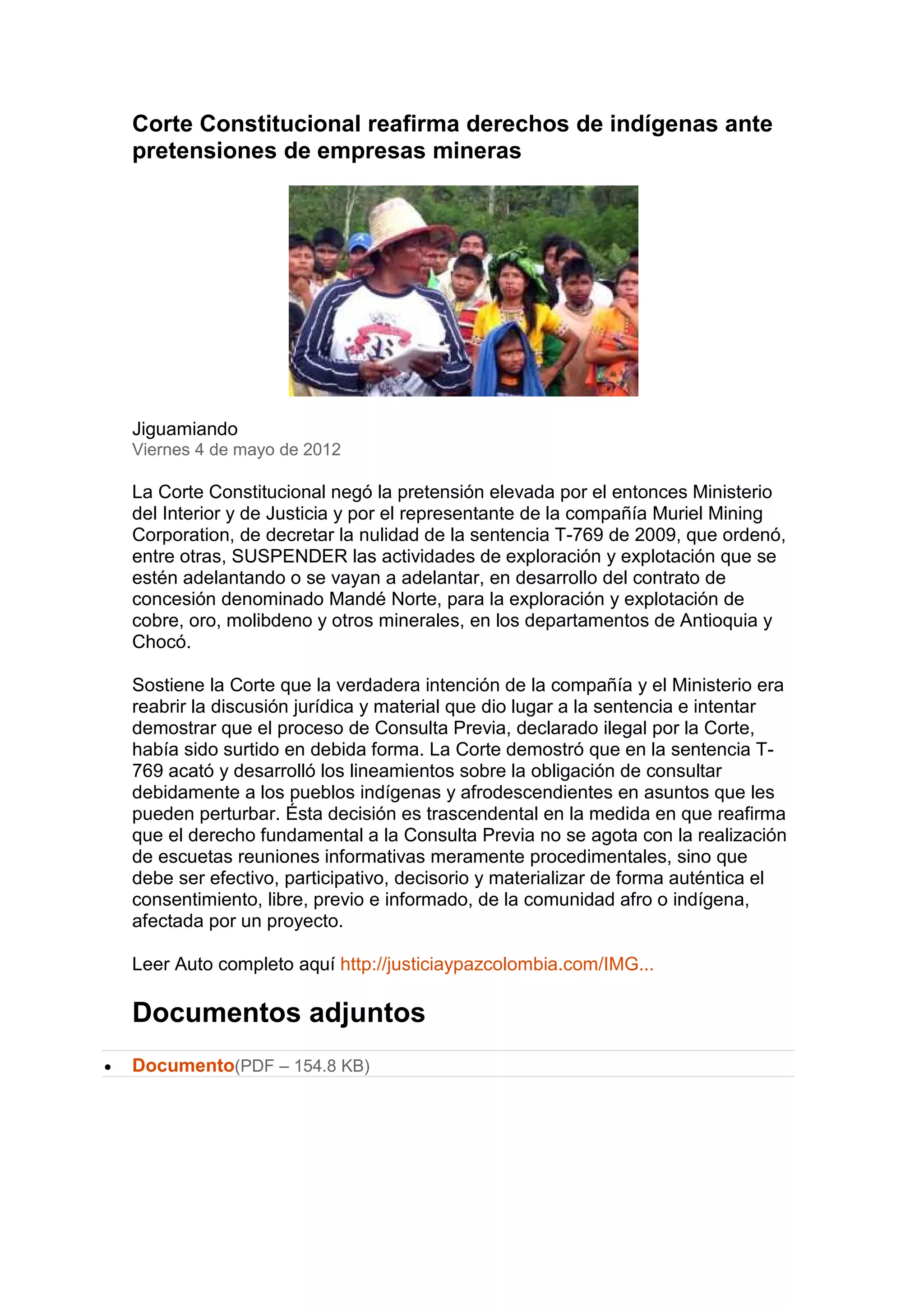 La Corte Constitucional negó la pretensión de una compañía minera y el Ministerio del Interior de anular una sentencia que ordenó suspender actividades mineras. La Corte determinó que la consulta previa a los indígenas sobre estos proyectos debe ser efectiva, participativa y obtener su consentimiento libre e informado, no solo reuniones informativas. Esta decisión reafirma los derechos de los pueblos indígenas ante las pretensiones de empresas mineras.