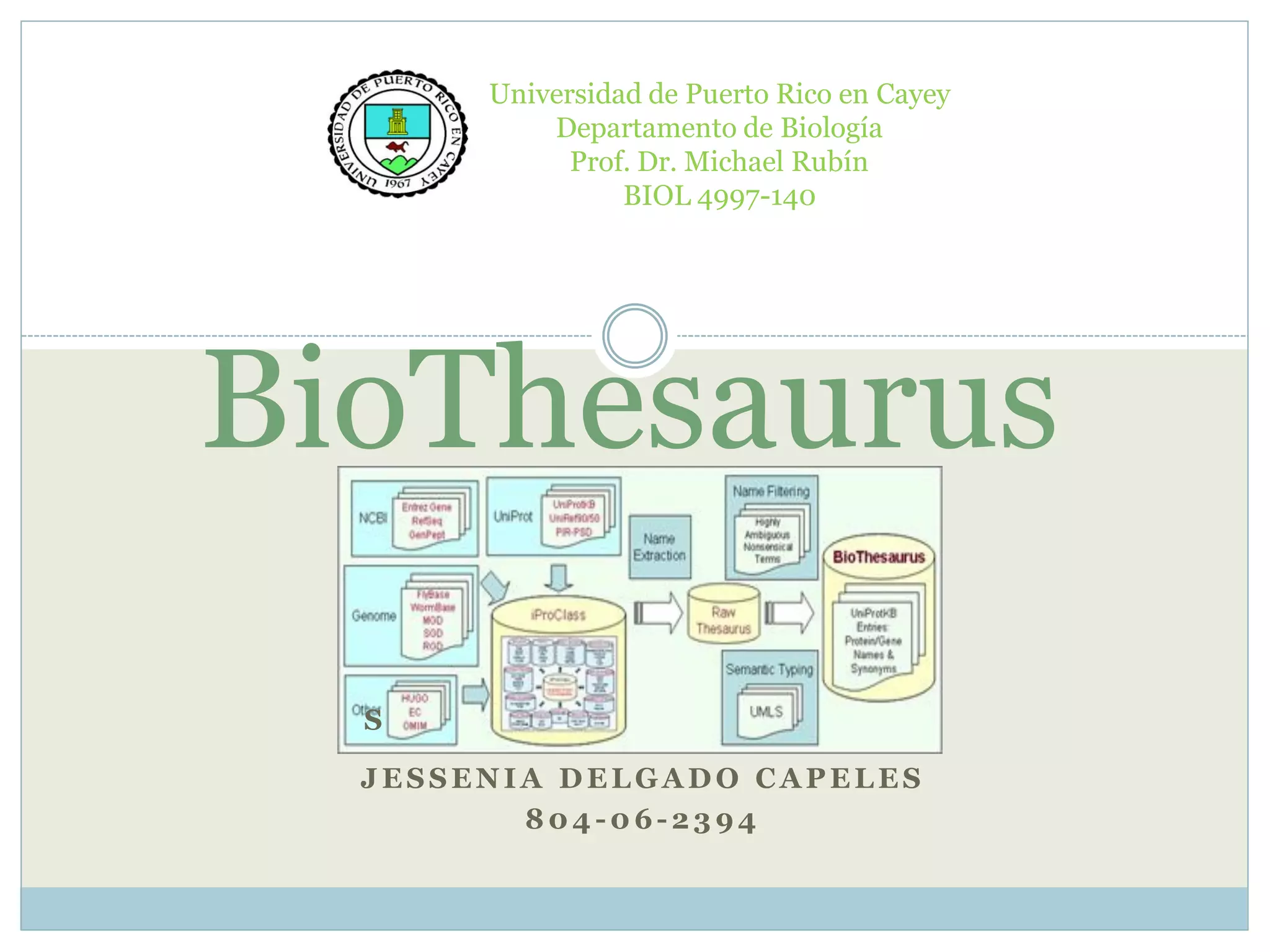 El documento proporciona información sobre un curso de biología en la Universidad de Puerto Rico en Cayey impartido por el Prof. Dr. Michael Rubín. La estudiante Jessenia Delgado Capeles con número de identificación 804-06-2394 está cursando la asignatura BIOL 4997-140 y el documento incluye un enlace a BioThesaurus.