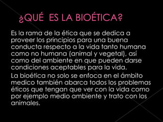 La bioética se dedica a establecer principios éticos para la conducta humana respecto a la vida. Los cuatro principios centrales de la bioética son la autonomía, la no maleficencia, la beneficencia y la justicia. La Declaración Universal de los Derechos Humanos de 1948 estableció derechos fundamentales aplicables a todas las personas.