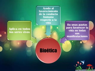El documento habla sobre la bioética y cómo guía la conducta humana respecto a la vida. Explora temas controvertidos como el aborto inducido, el suicidio y la eutanasia. Estos temas generan debates sobre interrupción del desarrollo, razones para el suicidio como la depresión, y provocar la muerte de alguien que sufre una enfermedad incurable.