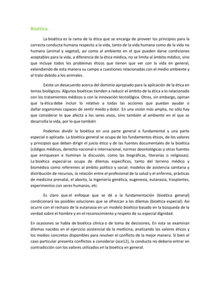 Este documento presenta una introducción a la bioética, incluyendo sus principales ámbitos y dilemas. Define la bioética como la rama ética que guía la conducta humana respecto a la vida, tanto humana como no humana. Explica que la bioética general se ocupa de los fundamentos éticos y valores, mientras que la bioética especial analiza dilemas específicos como la ingeniería genética, eutanasia y experimentos con seres humanos. Finalmente, discute opiniones sobre la manipulación genética y el rol de regular la ci