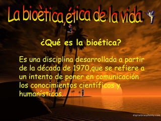 El documento trata sobre la bioética y la ética ecológica. Explica que la bioética analiza los interrogantes éticos suscitados por las ciencias de la vida y abarca la ética profesional médica y la ética ambiental. También discute temas como la ingeniería genética, los principios de la bioética como no dañar y la justicia, y la necesidad de un desarrollo sostenible que proteja el medio ambiente para las generaciones futuras.