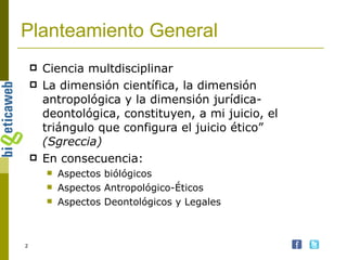 El documento discute varios temas relacionados con la bioética en el inicio de la vida desde una perspectiva multidisciplinar. Aborda las dimensiones biológicas, antropológicas, jurídicas y el magisterio de la Iglesia Católica sobre estos temas. También analiza las dificultades del razonamiento ético frente a los avances científicos y tecnológicos, y revisa la posición de la Iglesia sobre el estatuto del embrión a lo largo de la historia.