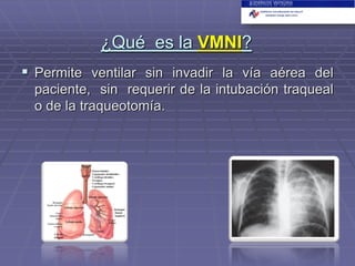 Este documento describe la ventilación mecánica no invasiva (VMNI) utilizando dos ventiladores, el Vivo y el Vision. Explica cómo se seleccionan los pacientes para VMNI, los modos ventilatorios como CPAP y BIPAP, y los parámetros que se pueden ajustar. También detalla el montaje de los fungibles requeridos y los pasos para poner en funcionamiento ambos ventiladores de forma segura.