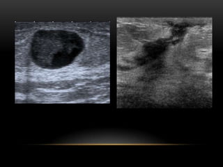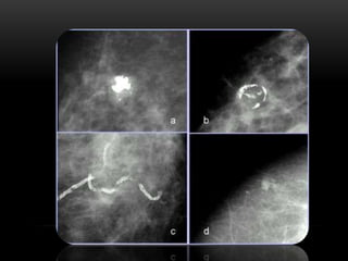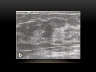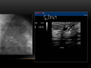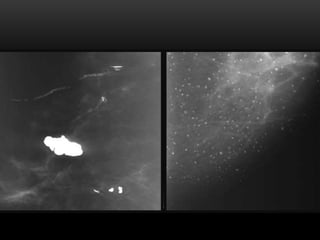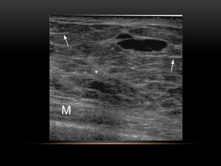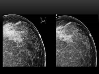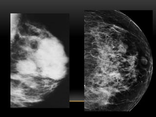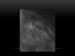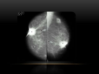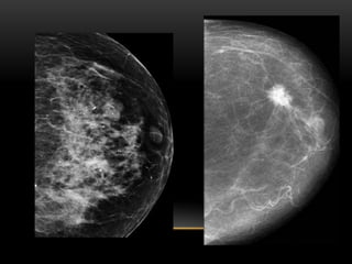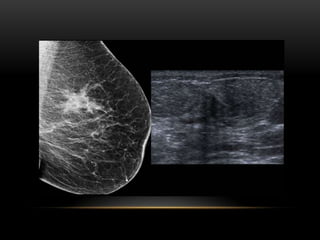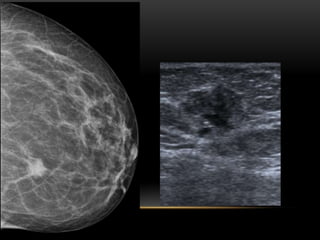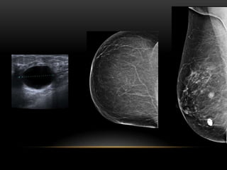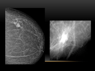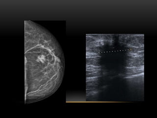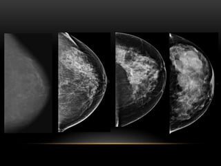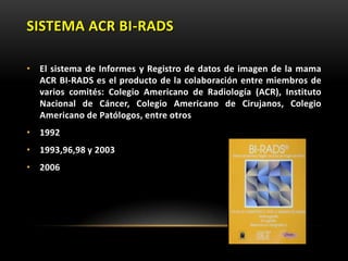 El documento proporciona información sobre el sistema BIRADS para la clasificación de hallazgos mamográficos y ecográficos. Explica las categorías BIRADS de 0 a 6, las características de las lesiones en cada categoría y las recomendaciones de manejo. También describe patrones del tejido mamario, nódulos, calcificaciones, quistes y otros hallazgos, y cómo se clasifican e informan dentro del sistema BIRADS.