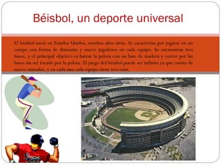 El béisbol se originó en Estados Unidos y se juega en un campo de diamante con nueve jugadores por equipo. Cada equipo intenta anotar carreras bateando la pelota con un bate de madera y corriendo las bases sin ser eliminado, y cada equipo tiene tres outs por entrada en un juego que consta de nueve entradas. El béisbol se juega en todo el mundo, pero los mejores equipos son de Estados Unidos, el Caribe, Italia, Australia y Japón, a pesar de que no requiere mucha condición
