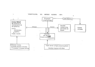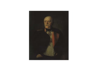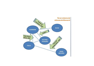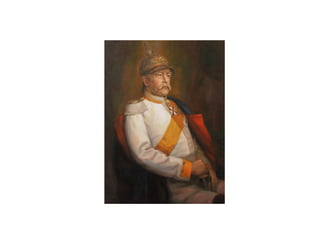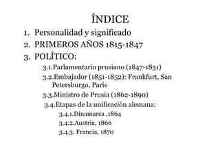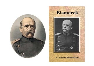 Este documento resume la vida y carrera política de Otto von Bismarck, el estadista prusiano que unificó Alemania en el siglo XIX. Detalla sus primeros años y educación, su carrera como parlamentario y embajador prusiano, y su papel como ministro prusiano y canciller de Alemania, donde lideró las guerras contra Dinamarca, Austria y Francia que condujeron a la unificación alemana y al establecimiento del Imperio alemán en 1871 bajo el liderazgo de Prusia.