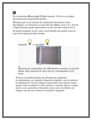 Un bit es la unidad mínima de información en sistemas digitales y puede tener un valor de 0 o 1. Un byte está compuesto por 8 bits y es la unidad básica de almacenamiento de datos. Un kilobyte equivale a 1024 bytes, aunque también se usa para referirse a 1000 bytes. Un megabyte equivale a 1000000 bytes y un terabyte a 1000000000 bytes.