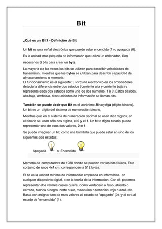 Un bit es la unidad más pequeña de información en un ordenador que puede estar en uno de dos estados, encendido (1) u apagado (0). Ocho bits forman un byte que se usa para medir la capacidad de almacenamiento, mientras que los bits se usan para describir velocidades de transmisión. Los bits se combinan para representar números, palabras e imágenes mediante su estado encendido o apagado.