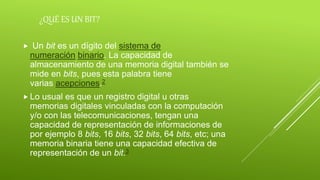 Un bit es la unidad más pequeña de información digital, mientras que un byte consta de 8 bits y es la unidad básica de almacenamiento y transmisión de datos. Un terabyte equivale a 1000 gigabytes y se usa para medir grandes cantidades de datos almacenados, como la capacidad de los discos duros de las computadoras.