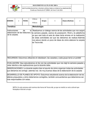 El documento resume las actividades realizadas en la segunda semana de clases del grupo 3 en la asignatura de Tecno-lab en la Institución Educativa Colegio Loyola para la Ciencia y la Innovación. La docente realizó un diálogo sobre las instrucciones para elaborar bitácoras y carpetas, y les dio ideas para corregir actividades en PowerPoint, Word y la plataforma. También explicó cómo organizar todas las actividades y les brindó buenas ideas para elaborar la carpeta de Tecno-lab.