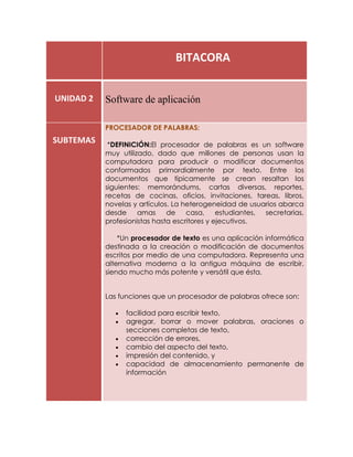 Este documento proporciona información sobre procesadores de palabras y hojas de cálculo. Define un procesador de palabras como software para crear y modificar documentos de texto, e identifica las cuatro etapas típicas de producción de documentos: planeación y creación, edición, dar formato e impresión. También define una hoja de cálculo como una herramienta para organizar y analizar datos numéricos, y explica cómo crear una hoja de cálculo básica, introducir fórmulas y funciones, y seleccionar celdas y