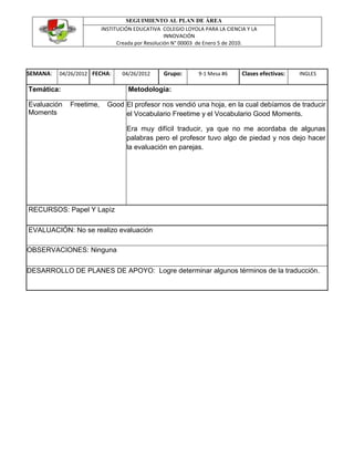 El resumen se refiere a la semana del 26 de abril de 2012 en la Institución Educativa Colegio Loyola para la Ciencia y la Innovación. Durante la clase de inglés, los estudiantes trabajaron en parejas para traducir vocabulario sobre tiempo libre y buenos momentos, aunque fue difícil debido a que algunos no recordaban todas las palabras. No hubo una evaluación formal.