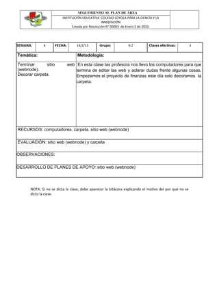 Este documento resume las actividades de una clase en la Institución Educativa Colegio Loyola para la Ciencia y la Innovación. En la clase, los estudiantes terminaron de editar su sitio web en webnode y decoraron una carpeta para su proyecto de finanzas.