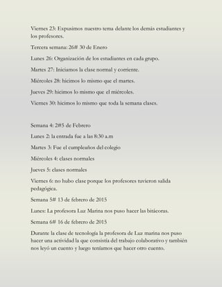 El documento presenta un resumen semanal de las actividades escolares. Cada semana, los estudiantes participaron en diferentes proyectos grupales como presentaciones sobre temas como el chikunguya y trabajos colaborativos. También asistieron a reuniones de padres, vieron películas sobre el trabajo en equipo y realizaron otras tareas escolares regulares.