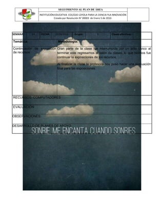 El resumen describe el seguimiento del plan de área de la Institución Educativa Colegio Loyola para la Ciencia y la Innovación durante la semana 24. La clase del día 22 de agosto de 2013 con el grupo 9 continuó con la exposición de recursos después de ser interrumpida por un acto cívico, y al finalizar la profesora evaluó a los estudiantes sobre las exposiciones.
