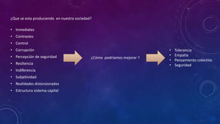 El documento trata sobre temas como la tolerancia, la ecología mental, la subjetividad y nuevos paradigmas. Propone que para mejorar la sociedad se debe fomentar la tolerancia, la empatía y el pensamiento colectivo. Incluye bocetos conceptuales sobre diseños que integran la tecnología y fomentan la interacción entre personas de manera respetuosa y empática.