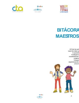 Este documento presenta la bitácora de un grupo de investigación del programa Ondas. Resume las diferentes etapas de su proceso investigativo, incluyendo la formulación de preguntas iniciales, la selección de una pregunta guía, el diseño de la trayectoria de indagación y las actividades realizadas. El grupo se enfocó en investigar cómo reducir los colorantes contaminantes usados en la industria textil de la región para proteger los recursos hídricos.