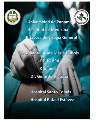 Este documento es una bitácora de una rotación de cirugía general donde el autor narra sus experiencias como estudiante de medicina en dos hospitales. Describe las actividades realizadas en cada hospital, incluyendo consultas externas, procedimientos quirúrgicos observados, y lecciones aprendidas de sus preceptores. El objetivo es transmitir todo lo aprendido durante la rotación, con énfasis en las diferentes experiencias y temas revisados.