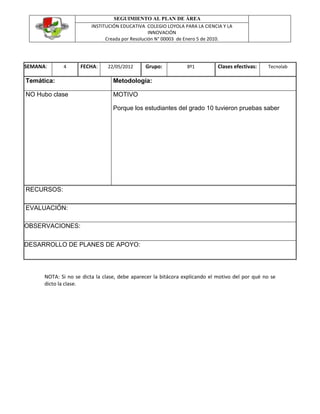 El resumen describe el seguimiento del plan de área de la semana 4 del 22 de mayo de 2012 para el grupo de 8o1 en el Colegio Loyola para la Ciencia y la Innovación. No se dictó la clase planificada debido a que los estudiantes de grado 10 tenían que presentar pruebas saber ese día.