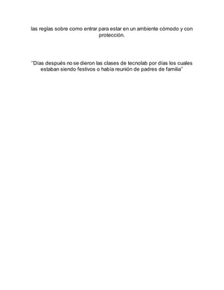 La maestra de tecnología orientó a los nuevos estudiantes en el laboratorio explicándoles paso a paso cómo funcionaba el Colegio Loyola. A pesar de que los estudiantes se descontrolaban, la maestra logró calmarlos explicándoles las reglas. Más tarde, llegaron los orientadores del SENA y presentaron el área de Materiales, explicando los elementos y reglas de seguridad necesarios para trabajar de manera cómoda y protegida en el laboratorio.