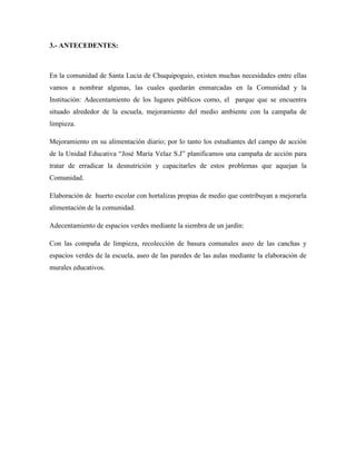 Este documento contiene información sobre varias actividades realizadas por estudiantes en la Unidad Educativa Fiscal Intercultural Bilingüe “Achullay” en Achullay, Guamote, Chimborazo, Ecuador. Las actividades incluyeron el adecentamiento del colegio mediante una limpieza, la siembra de un huerto escolar con plantas ornamentales y alimenticias, la creación de un mural, y la instalación de ladrillos alrededor del huerto para proteger las plantas. Los objetivos fueron mejorar el aspecto f