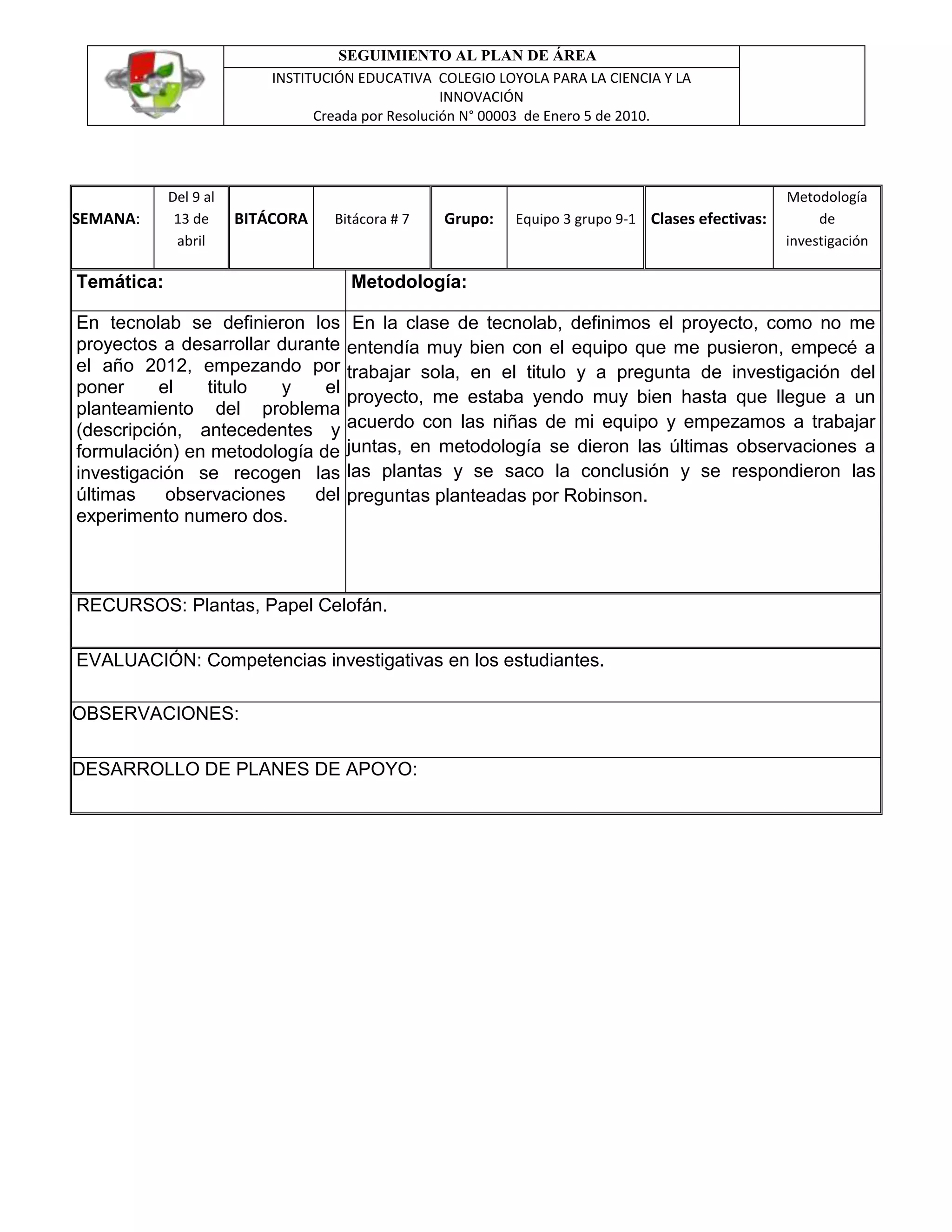 El resumen describe el seguimiento del plan de área de la Institución Educativa Colegio Loyola para la Ciencia y la Innovación. En la semana del 9 al 13 de abril, el grupo 3 del equipo 9-1 definió los proyectos a desarrollar durante el año 2012 en la clase de tecnolab, incluyendo el título y la pregunta de investigación de su proyecto. En metodología de investigación, realizaron las últimas observaciones de su experimento número dos y sacaron conclusiones para responder las preguntas planteadas.