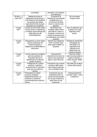 Este documento es una bitácora que resume las actividades realizadas por un grupo de aprendices del SENA entre el 14 de abril y el 6 de mayo de 2011. En este periodo, el grupo elaboró carteleras, blogs, diapositivas y obras teatrales sobre el SENA, realizó pruebas de estilos de aprendizaje, leyó libros, organizó grupos para exponer temas, y trabajó en el desarrollo de un proyecto recibiendo asesoría de instructores.
