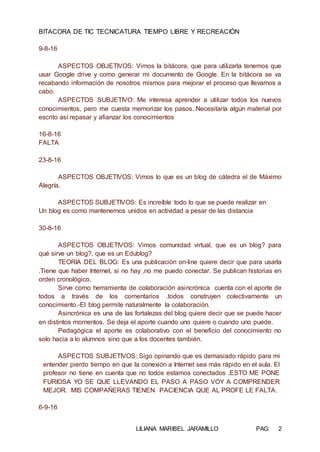 Este documento es la bitácora de una alumna de la carrera de Tiempo Libre y Recreación. En ella, la alumna describe las actividades realizadas en la clase de TIC, incluyendo el uso de herramientas digitales como blogs, videos de Youtube y Pixton. La alumna expresa que le gustan los nuevos conocimientos pero que el ritmo de la clase es demasiado rápido y le cuesta seguir el paso. En su reflexión final, reconoce su responsabilidad pero sugiere que el profesor preste más asistencia