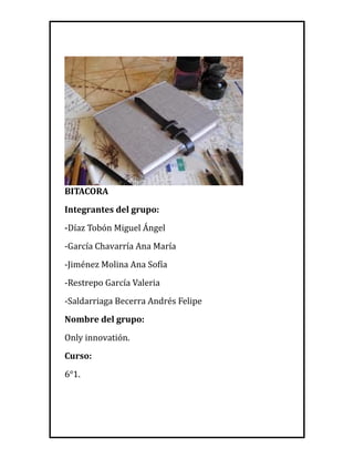 Este documento contiene las bitácoras semanales de un grupo de estudiantes del grado 6°1 durante 15 semanas. Cada semana describe brevemente las actividades realizadas cada día, incluyendo clases, proyectos, reuniones y eventos. Los temas cubiertos incluyen trabajo en equipo, proyectos escolares, elecciones estudiantiles, celebraciones y evaluaciones.