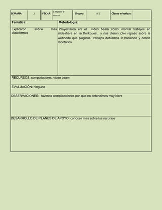 Este resumen describe el seguimiento del plan de área de la Institución Educativa Colegio Loyola para la Ciencia y la Innovación durante las primeras 6 semanas. Se explicaron las plataformas en las que los estudiantes debían subir trabajos, se enseñó cómo usar recursos como Thinkquest y Slideshare, y los estudiantes recorrieron la escuela para identificar fallas. Luego, los estudiantes fueron organizados en grupos basados en sus intereses y en las semanas 5 y 6 no hubo clase debido a días festivos.