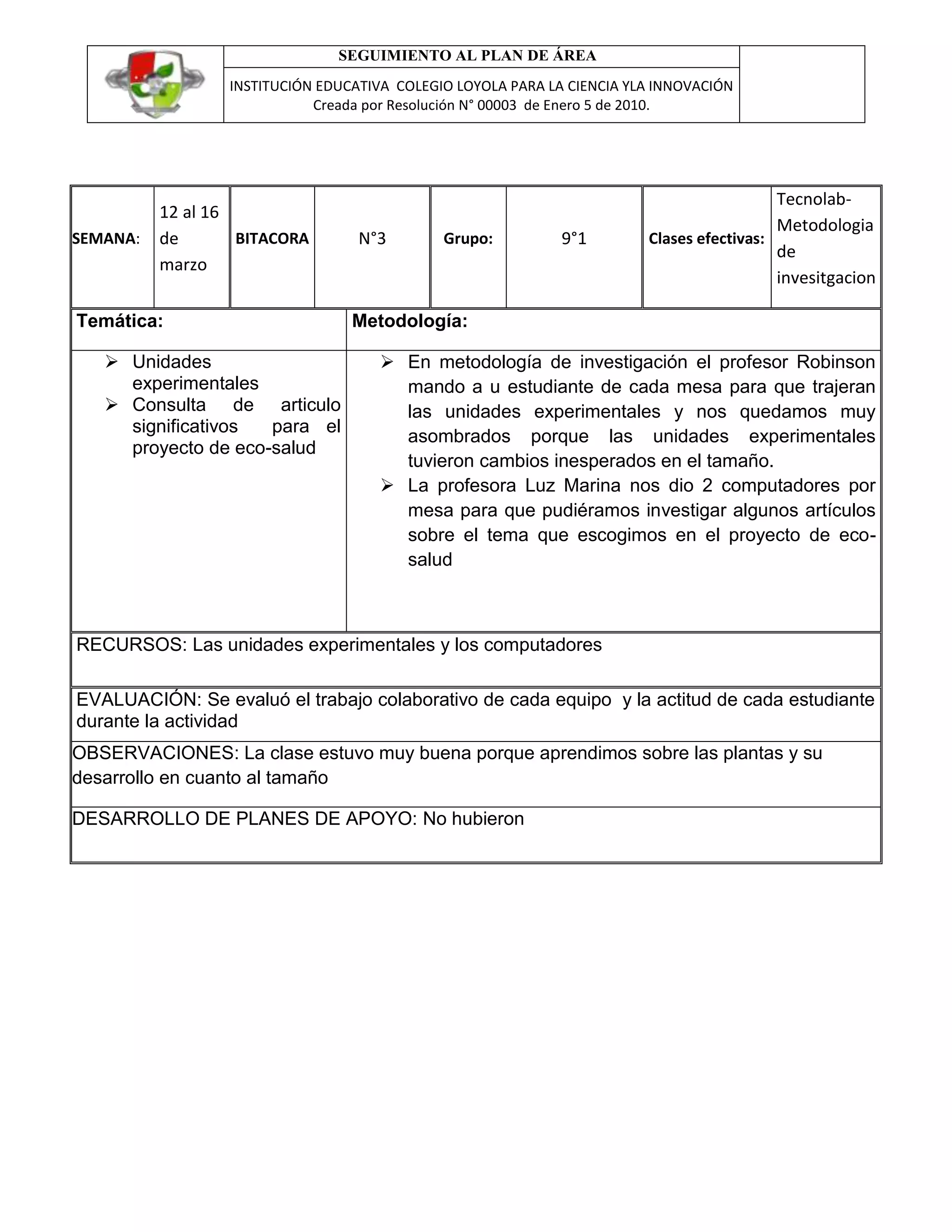 El documento resume las actividades realizadas por el grupo 9°1 durante la tercera semana de clases en la asignatura de Tecnolab en la Institución Educativa Colegio Loyola para la Ciencia y la Innovación. Los estudiantes observaron el desarrollo inesperado en el tamaño de las unidades experimentales y realizaron investigación sobre artículos relacionados con su proyecto de eco-salud utilizando computadores provistos por la profesora. La clase permitió aprender sobre el desarrollo de las plantas y su evaluación se