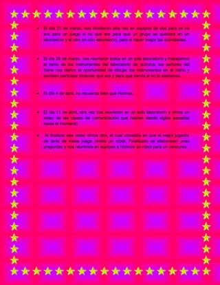 La bitácora describe las actividades realizadas por el estudiante durante las primeras semanas de su clase de Tecnolab. Realizaron actividades de integración en las primeras dos semanas. Luego, asistieron a clases prácticas en los laboratorios donde conocieron a los profesores del Sena, aprendieron sobre los instrumentos y equipos de los laboratorios, y participaron en dinámicas y juegos en grupos para practicar normas de seguridad.