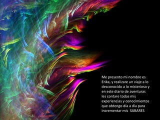 Este documento es el diario de aventuras de una estudiante llamada Erika en el que describe sus experiencias durante varias semanas aprendiendo español. En la primera semana, Erika conoció a una joven llamada Ullenid que le enseñó sobre el español y realizó una actividad para conocer mejor a su compañera Valeria. En la segunda semana, el grupo compartió los escritos sobre sus compañeros, leyó un mito chino, y aprendió sobre la cultura indígena. Desde el 14 de febrero hasta la fecha, Erika