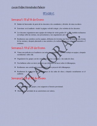 El documento resume las actividades realizadas por Lucas Felipe Hernández Palacio durante las primeras 5 semanas del año escolar. En la primera semana, los estudiantes recibieron la bienvenida de los docentes y se organizaron en equipos de trabajo. En la segunda semana, vieron una película sobre el trabajo en equipo y realizaron un microproyecto sobre el chikungunya. En la tercera semana, se les asignó un horario provisional y hicieron un autorretrato con valores. En la cuarta semana, hicieron una actividad de integración y reestruct