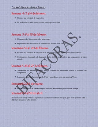 El documento resume 9 semanas de actividades en el colegio Loyola. Los estudiantes realizaron presentaciones, películas y proyectos sobre normas, trabajo en equipo y el virus del chikungunya. También elaboraron bitácoras de sus actividades, aprendieron sobre herramientas de Word y compartieron comentarios para mejorar sus trabajos.