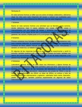 Este documento contiene las bitácoras de laboratorio de 14 semanas. En las primeras semanas, los estudiantes se presentaron a su nuevo colegio y profesores, y comenzaron a realizar actividades grupales para integrarse. Más adelante, conformaron equipos de investigación y eligieron temas para proyectos como la discriminación musical y los servicios públicos. A lo largo de las semanas, los estudiantes participaron en diversas actividades prácticas y teóricas en los laboratorios de química, electrónica y biot
