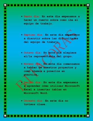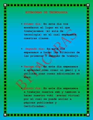 El documento resume las actividades de los primeros trece días de un curso de tecnología. En el primer día, los estudiantes conocieron el aula de tecnología. En los días siguientes, empezaron a hacer bitácoras, crear cuentas de gmail, trabajar en una página web y avatar virtual, elegir un representante del grupo, y aprender a usar Excel e insertar tablas en Word.