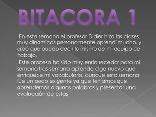 La estudiante aprendió mucho en las clases dinámicas del profesor Didier a pesar de que tuvo que aprender nuevos vocabularios y presentar una evaluación que la presionó. Aunque la semana fue exigente, los talleres le permitieron adquirir nuevos conocimientos. La siguiente semana repasaron vocabularios y realizaron actividades, pero no estaban preparados para un examen que el profesor decidió aplazar. La estudiante se esforzó y aprendió palabras útiles.