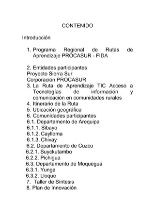 Este documento describe una Ruta de Aprendizaje sobre el acceso a tecnologías de información y comunicación en comunidades rurales en Perú. La ruta involucra a varias asociaciones y municipios en Arequipa, Cuzco y Moquegua y busca enseñar sobre la gestión efectiva de cabinas de internet para mejorar la calidad de vida de los residentes rurales. El Proyecto Sierra Sur y la Corporación PROCASUR organizan la ruta para compartir experiencias sobre cómo promover y ampliar el uso de las cabinas de internet existentes.